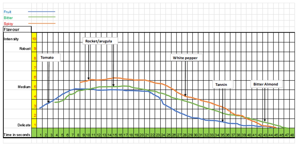 The addition of the fruits, vegetal, spicy and nutty food ingredient flavours detected, and where on the palate they occur, completes an evocative picture for the consumer of the oil.