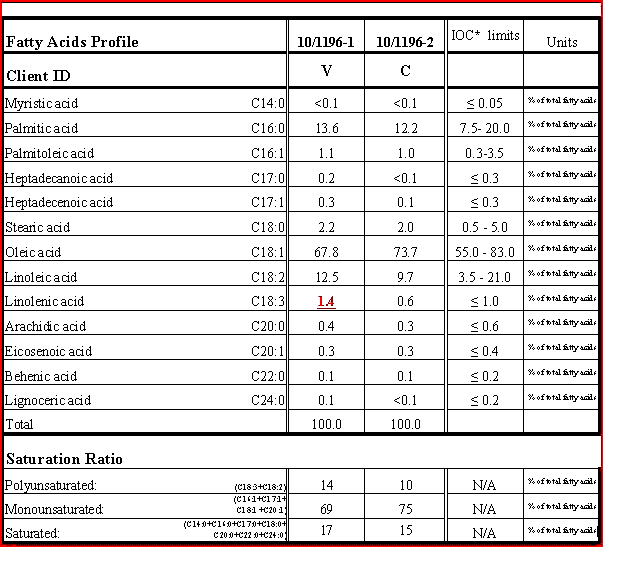 Below is a recent analysis of the fatty acid profile of two olive oils. The main saturated fats are myristic, palmitic and stearic. Monounsaturated is oleic and polyunsaturated are linoleic and linolenic.